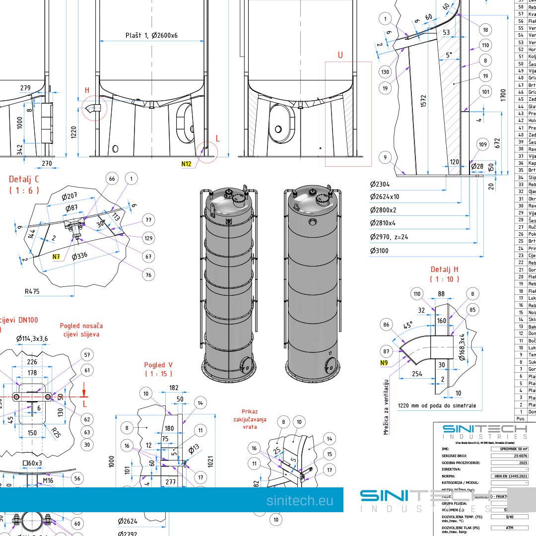 Materijal od kojeg su spremnici napravljeni je nehrđajuči čelik AISI316, a finalna dimenzija svakog spremnika je cca. ⌀ 2600 mm x 12000 mm, svaki je težak oko 8,5t.